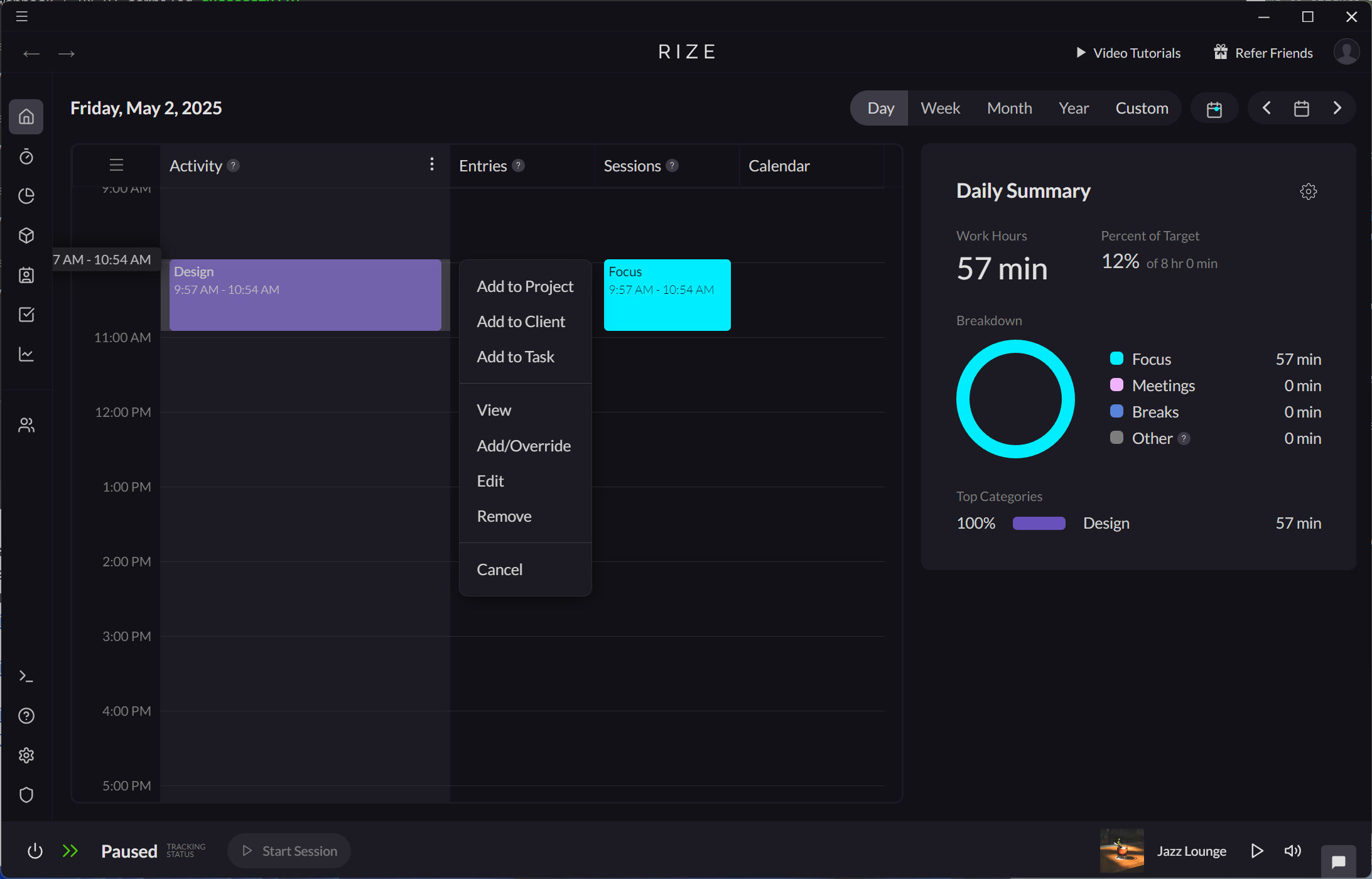 Rize allows you to assign your tracked time to specific tasks, helping you better understand how your time is distributed across different activities.